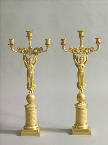 Bronze, feuervergoldet. Der Sockel mit Dekor von Palmetten und Rosetten, darauf Globus mit Viktoria, die Kerzenarme halten; mit den aufgesetzten fein gearbeiteten Tüllen