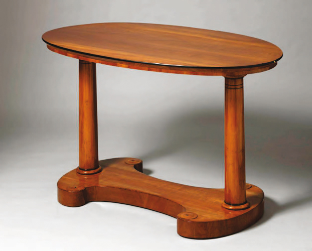 Kirschbaumfurnier; zwei runde Beine; unterer Abschluss mit durchgehendem Sockel, außen in Voluten verlaufend;